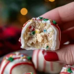Esta receta usa pasteles de árbol de Navidad y queso crema. Puedes ver una receta parecida aquí: Trufas de pastel de árbol de Navidad. La mezcla es suave y se cubre con chocolate blanco y sprinkles.