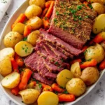 El brisket se puede servir caliente, junto con las verduras y un poco de caldo. También puedes acompañarlo con puré de papas o pan crujiente. Esta receta es ideal para un almuerzo o cena en familia.