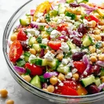 La Ensalada de Garbanzos Griega Rápida y Fácil une garbanzos, verduras y queso feta. Tiene sabor mediterráneo y es ligera. Se prepara en pocos minutos y sienta bien sola o como acompañamiento.
