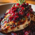 Servieren: Die Hähnchenbrustfilets auf einen Teller legen und mit der Preiselbeersoße und den frischen Kräutern garnieren.