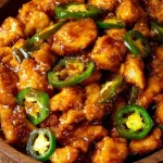 Pollo Jalapeño se puede servir caliente, acompañado de una porción de arroz. Puedes decorarlo con un poco más de semillas de sésamo o incluso con algunos pimientos jalapeños frescos para un toque extra. Sirve con una ensalada para un plato balanceado.
