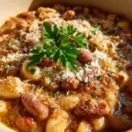 Sirve la Pasta Fagioli caliente en tazones. Puedes agregar un poco más de queso Parmigiano-Reggiano encima y un chorrito de aceite de oliva virgen extra para darle un toque especial. Este plato se puede acompañar con pan crujiente para disfrutar aún más.