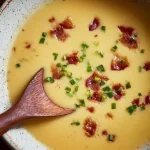 Sirve la sopa caliente en tazones. Puedes decorarla con cebollino fresco cortado y trocitos de tocino crujiente para darle un extra de sabor y presentación. Esta sopa se puede disfrutar sola o acompañada de pan crujiente.