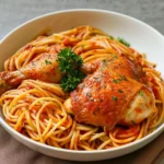 - El pollo se cocina lentamente en una salsa de tomate y especias, lo que lo hace tierno y jugoso, mientras que los tallarines absorben todos los sabores y se vuelven irresistibles.