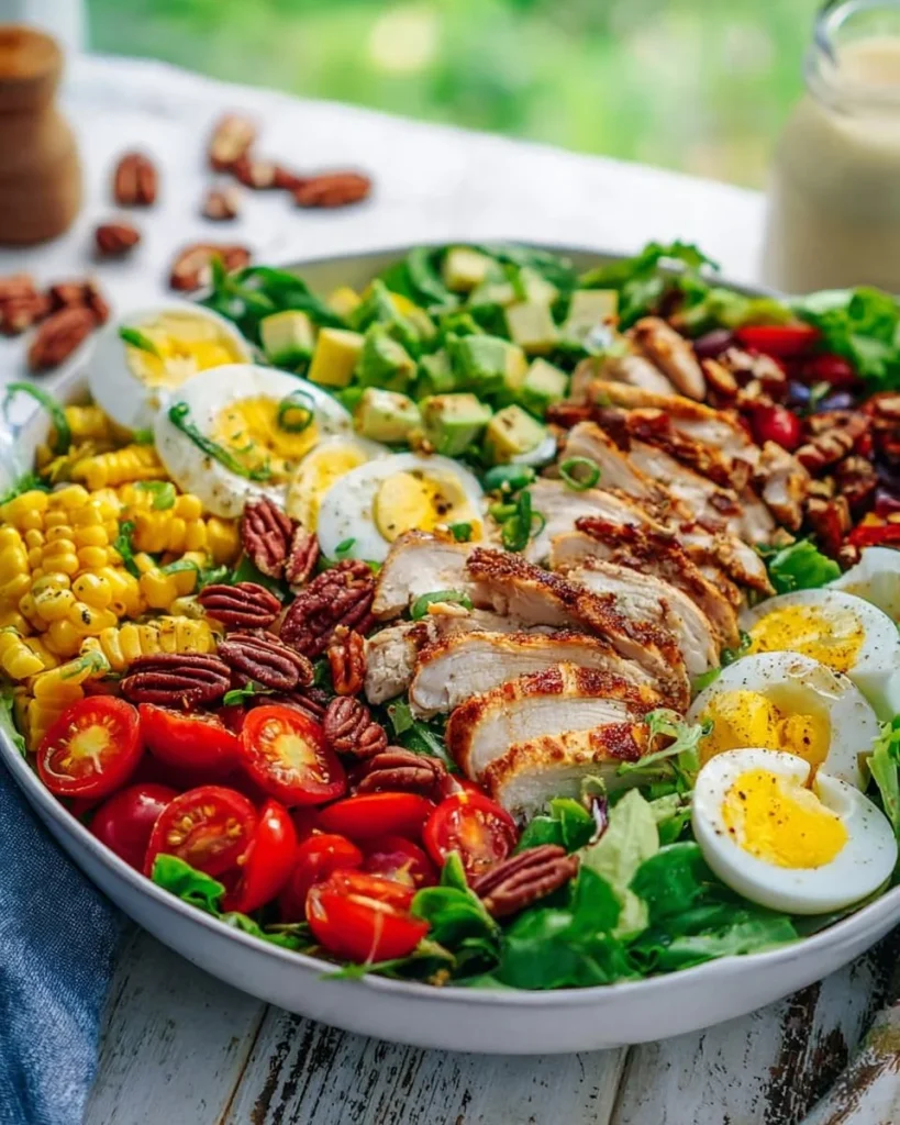 - En un tazón grande para ensalada, añade las hojas de lechuga, luego el pollo cocido, los tomates, el maíz, los huevos, las nueces y el aguacate como se muestra.