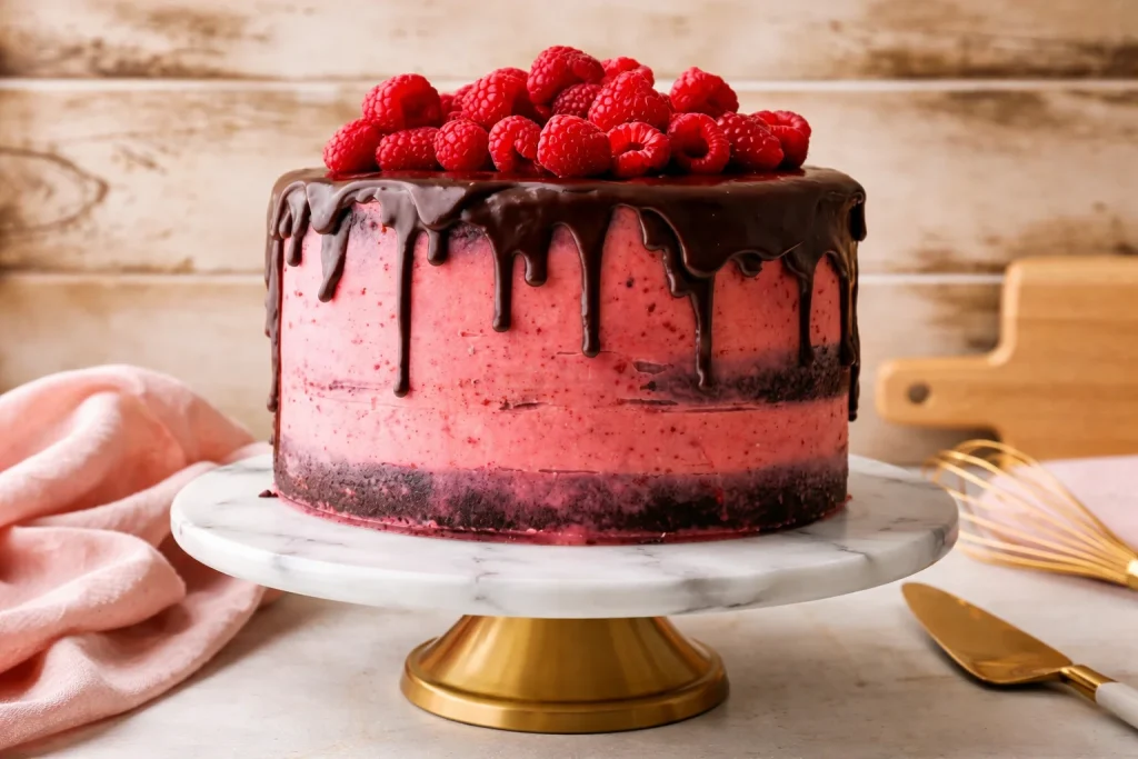 Usa ingredientes a temperatura ambiente para mezclar mejor. No sobrebatas la mezcla después de añadir la harina. Si el frosting queda muy dulce, ajusta con un poco más de puré de frambuesa. Guarda el pastel en un recipiente hermético en el refrigerador hasta 4 días.